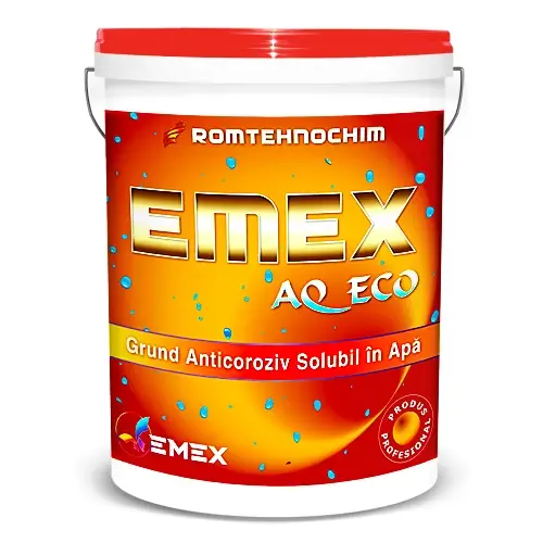 Grund Anticoroziv Solubil in Apa “Emex AQ Eco” - este fabricat pe baza de rasini acrilice speciale, cu solubilitate mare in apa, destinat utilizarii profesionale, in vederea protejarii primare a suprafetelor metalice, expuse unor medii cu agresivitate chimica moderata, situate la interior, sau la exterior, suprateran, expuse la factori ponderati de coroziune sau de mediu. Produsul contine pigmenti cu rezistenta la coroziune, fara saruri de plumb sau crom, agenti anticorozivi de ultima generatie, lipsiti de nocivitate sau impact asupra mediului, inhibitori specializati de coroziune, solubili in apa, aditivi specifici si extenderi.