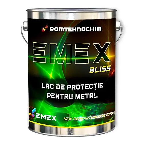 Lac Acrilic pentru Metal “Emex Bliss” - un produs monocomponent, de generatie noua, fabricat pe baza de rasini acrilice in solvent, ce asigura o buna protectie a suprafetelor metalice, atat feroase cat si neferoase, impotriva fenomenelor de oxidare, generate la contactul cu aerul, umiditatea, cu sarurile din atmosfera, etc. Contine aditivi speciali si plastifianti, pentru asigurarea unor performante superioare.