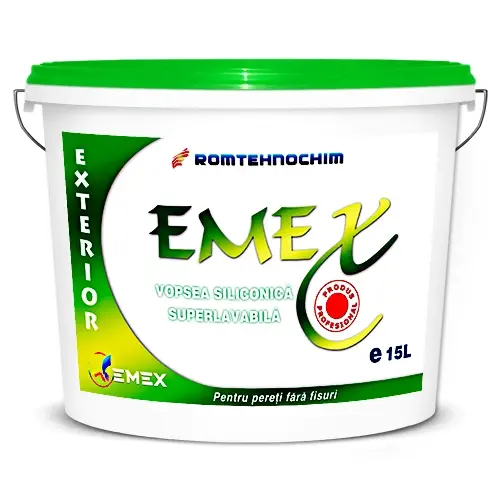 Vopsea Lavabila Siliconica de Exterior “Emex” - fabricata ca produs emulsionat de dispersie, pe baza de rasini siliconice si polimeri acrilici, aditivi specifici si fileri, este utilizata pentru finisarea decorativa superioara a tencuielilor exterioare, realizand un grad de alb ridicat, aderenta foarte mare si etalare excelenta.