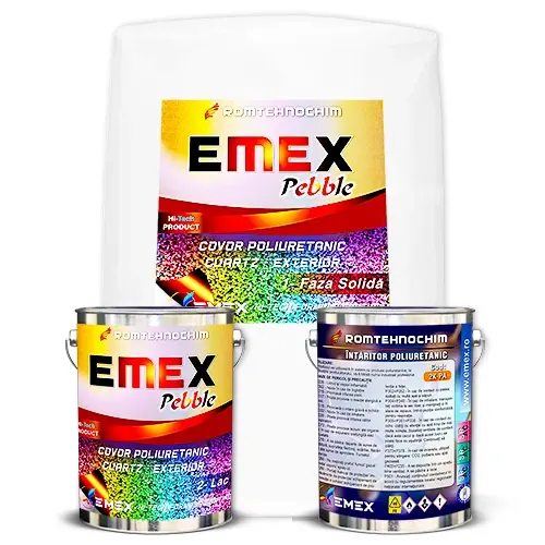 Pardoseala Poliuretanica Decorativa “Emex Pebble” - intalnita sub denumirea de Covor Poliuretanic de Piatra, este un sistem modern de acoperire si protectie, avand la baza o rasina poliuretanica solvent-free si granule de marmura, cu rezistenta ridicata. Desi se poate aplica si la interior, este destinat cu prioritate suprafetelor exterioare, unde rasina epoxidica nu este recomandata, datorita rezistentei acesteia mult mai slabe la lumina, fapt ce duce, in timp, la ingalbenire superficiala, patare, cretare si alte modificari nedorite de aspect.