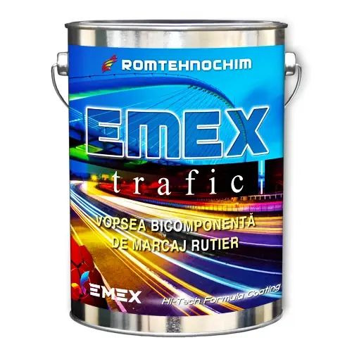 Vopsea Bicomponenta pentru Marcaj Rutier Rezonatoare “Emex Trafic” - produs cu aplicabilitate dedicata, de utilizare strict profesionala, ce se va folosi doar de personal calificat si cu experienta in utilizarea rasinilor bicomponente, pe baza de monomeri acrilici, de tip metilmetacrilat, pigmenti, aditivi speciali si fileri, cu materiale de adaos pentru duritate, cum ar fi faina de cuart si α-corindon, pentru marcaje rutiere normale, rezonatoare, sau pentru piste de biciclete, utilizat pentru marcarea oricarui tip de pavaj: mixtura asfaltica, beton, piatra, etc. Aceasta vopsea rezonatoare de marcaj rutier contine si perle de sticla, ce ajuta la reglarea grosimii, ce poate fi de 1 - 3 mm.