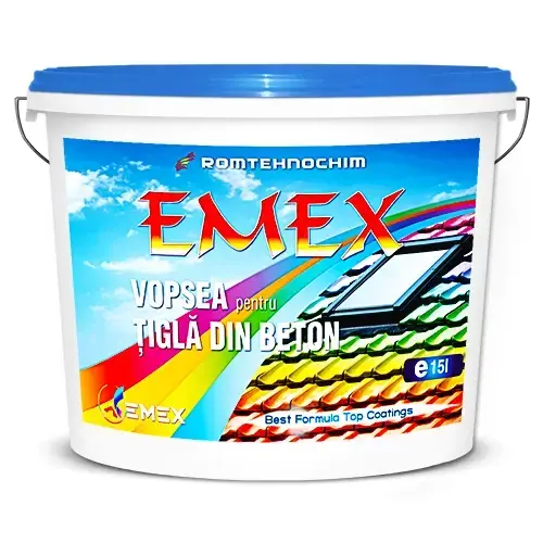 Vopsea de Tigla si Azbociment “Emex” - un produs solubil in apa, cu emisii COV sub limitele admise, pe baza de rasini acrilice pure, aditivi specifici, fileri si pigmenti, cu proprietati superioare de pelicula, special destinat protejarii si decorarii, prin vopsire, a placilor de tigla din beton sau azbociment, dar si alte suprafete din materiale minerale.